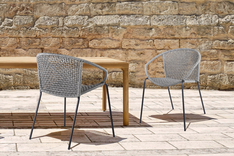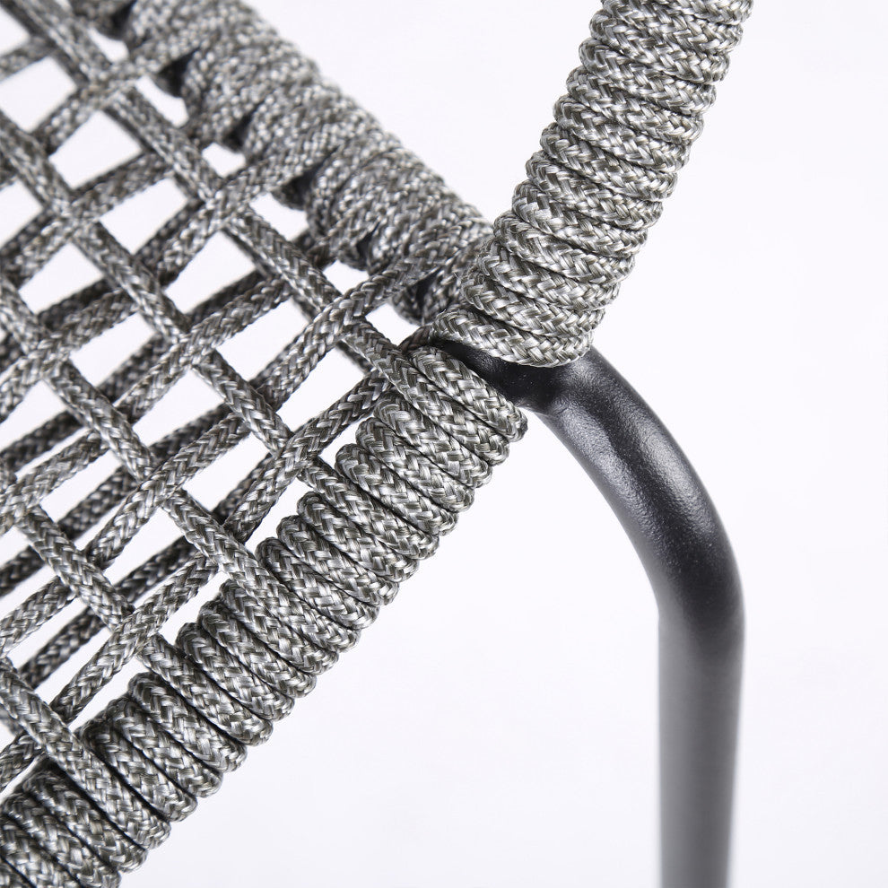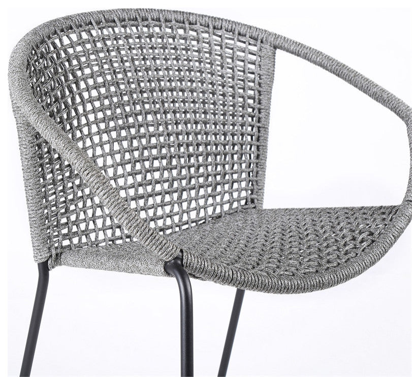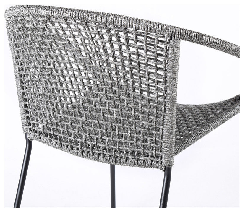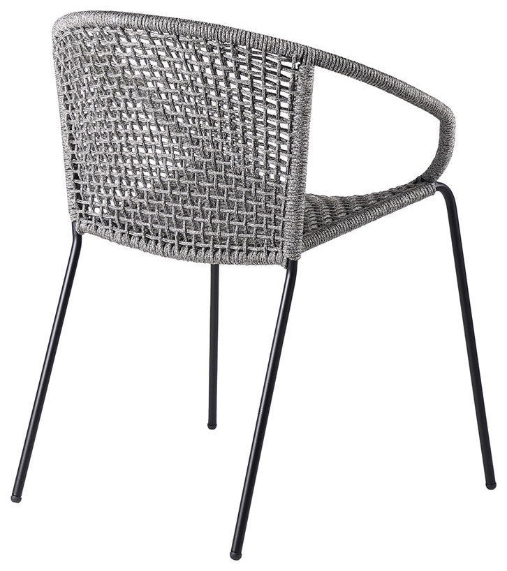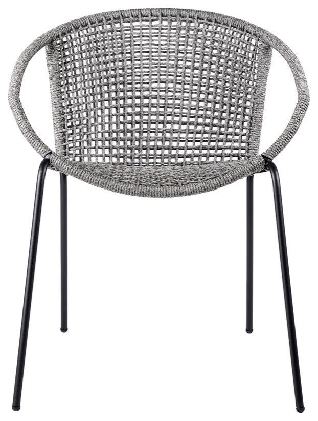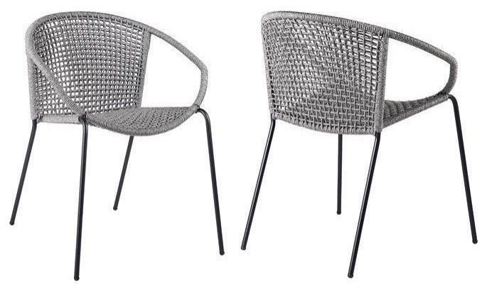 The Snack Indoor Outdoor Steel Dining Chair with Grey Rope - Set of 2 from Armen Living is a wonderfully intricate and fun design that will bring a unique aesthetic to your outdoor living space. Featuring an elaborate woven design and durable metal frame, this chair will blend seamlessly into your outdoor decor. The wide seat and back offer ample room for seating - creating an absolutely divine seating experience. This outdoor chair features a weather-resistant regatta cording tightly crosshatches the entire seat and back, providing supportive comfort so you enjoy time around the table with loved ones - also enhancing your seating experience with a softness that rivals most fabrics. Each chair is made with the best craftsmanship, with these chairs standing on top of durable metal legs in a black finish for a modern look. The Snack outdoor chair is available in your color choice of black, brick red, grey, or wasabi - choose your favorite to match your outdoor decor. The Snack Chairs are sold in a pair and are stackable. Product Dimensions: 26"W x 22"D x 31"H SH: 18".Features:MODERN AND CHARMING - The steel frames sport a black finish; the rope is woven with an intricate design on their seatbacks, all while being complemented by sleek straight hairpin legs.WOVEN ROPE - This seating option features an intricately woven rope design that offers excellent support and comfort for your enjoyment. The rope cord is not only durable, capable of lasting in harsh weather conditions, it is also extremely comfortable!BUILT TO LAST - Whether you place this masterfully crafted piece of furniture indoors or outdoors, you will be provided with stability and strength - always giving you a stable foundation with optimal comfort. In addition, this chair has a weight capacity of 250 lbs.SET OF TWO - The chair comes in a set of two chairs, giving you the option to mix and match around your indoor or outdoor living space or place them both together! This masterfully crafted furniture will look just as great indoors as it will outdoors - the choice is yours to make!COLOR PREFERENCES - When shopping for furniture, you often find yourself limited on color options when you finally find the right piece for your home. Armen Living offers a unique variety of color and finish options that are sure to fit into any existing design theme.NO ASSEMBLY " Save yourself the time and hassle of assembling when purchasing this piece of furniture from Armen Living. This piece of furniture ships fully assembled to you and makes decorating a breeze by allowing you to go from the box to the living room in no time!STANDING BEHIND OUR PRODUCTS - Armen Living stands behind all products sold and gladly offer our customers a 3 year limited manufacturer warranty on all outdoor furniture frames, and 2 year limited warranty on all outdoor cushions. Our products are made from high quality materials that will last for many years to come.Specification:" Product Dimensions: 31'''' H x 25'''' W x 24'''' D" Product Weight: 12 Pound" Seat Dimensions: 18'''' H x 19'''' W x 16'''' D" Shipping Dimensions: 34'''' H x 26'''' W x 26'''' D" Box Weight: 34 Pound" Finish Color: Black" Fabric Content: 100% Polypropelene" Seat Color: Gray