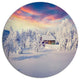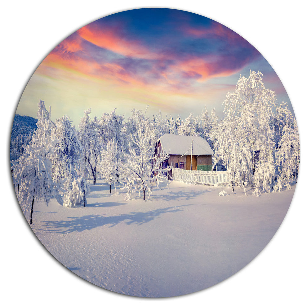 Snowfall Covering Trees And Houses, Landscape Disc Metal Artwork, 11"