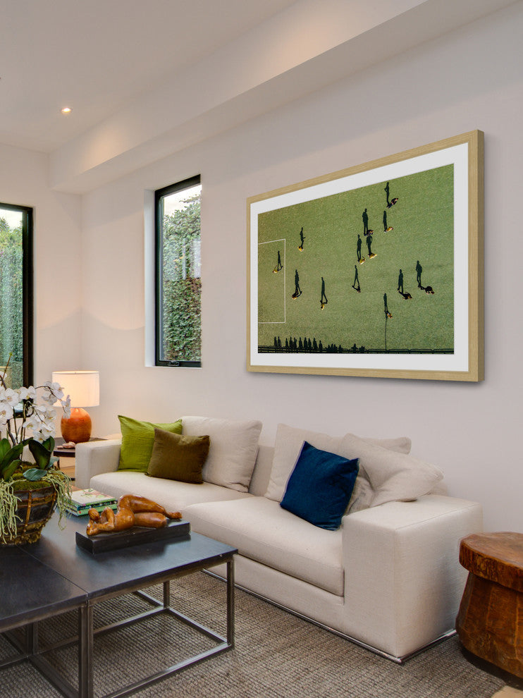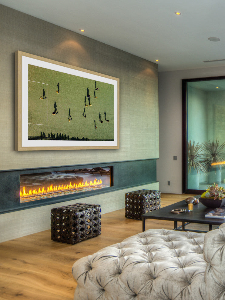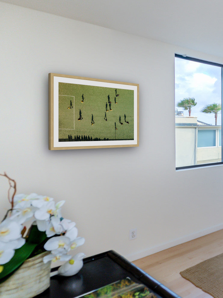 "Soccer" Framed Print by Karolis Janulis features vivid tones and supple artistry. Mounted in a gorgeous frame, this 18 inch wide by 12 inch tall piece will be an exceptional addition to any room. Top quality Giclee print on high resolution Archive Paper Artwork by Karolis Janulis Professionally framed and mounted on acid free archive matte High quality durable non-warping frame Arrives ready to hang Includes a certificate of authenticity Made in the USA