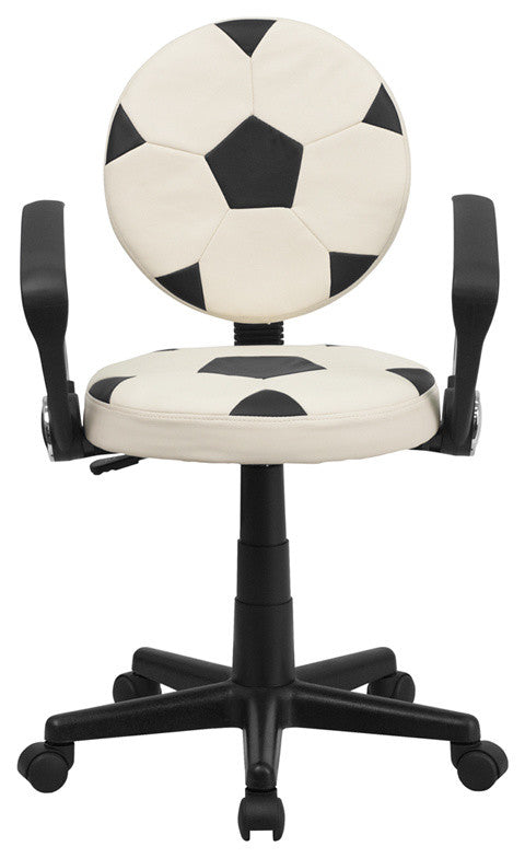 Bring your favorite sport to the desk with this Soccer Inspired Office Chair that is perfect for all young soccer fans! The round seat and back resembles two soccer balls that are upholstered in vinyl material for easy cleaning. This chair was designed to support the lower-to-mid back region. Chair easily swivels 360 degrees to get the maximum use of your workspace without strain. The pneumatic adjustment lever will allow you to easily adjust the seat to your desired height. With an affordable price tag it is sure to please the young soccer fan in your home. [BT-6177-SOC-A-GG]