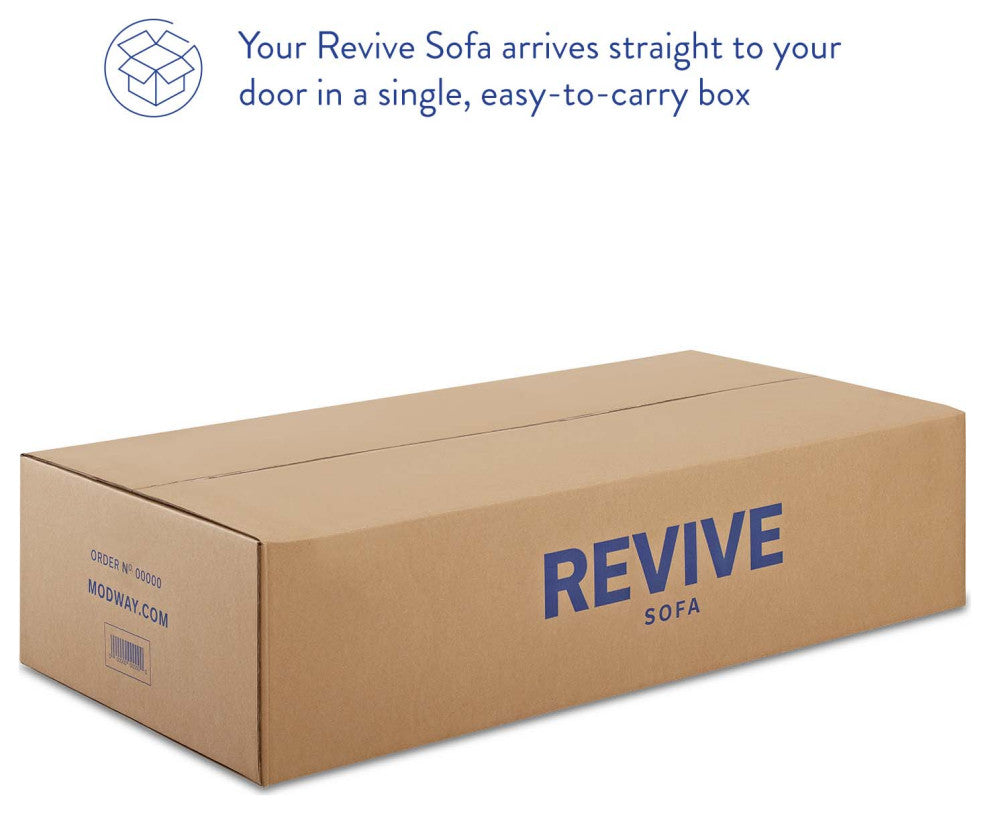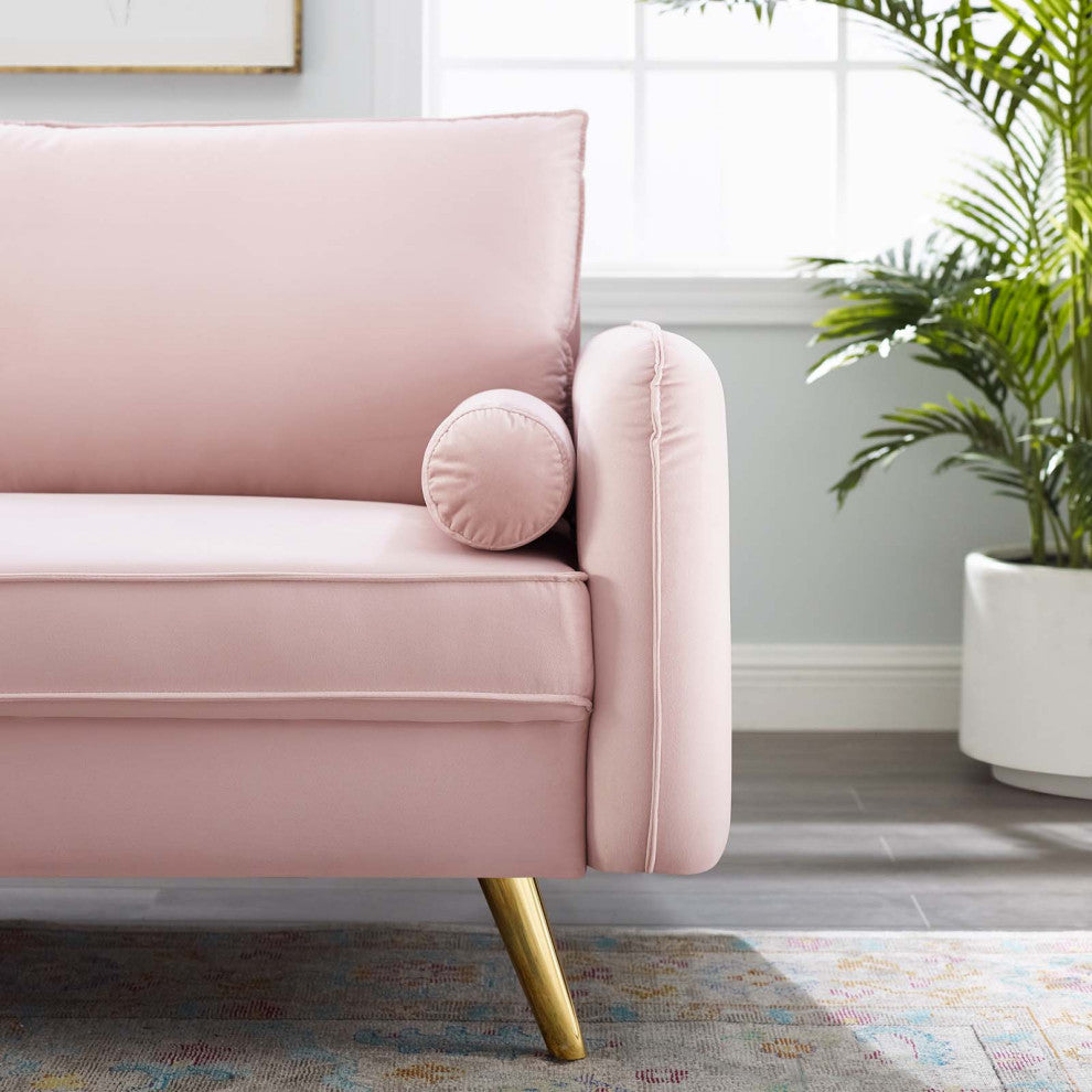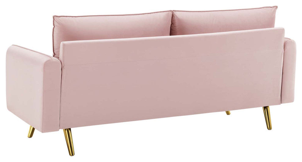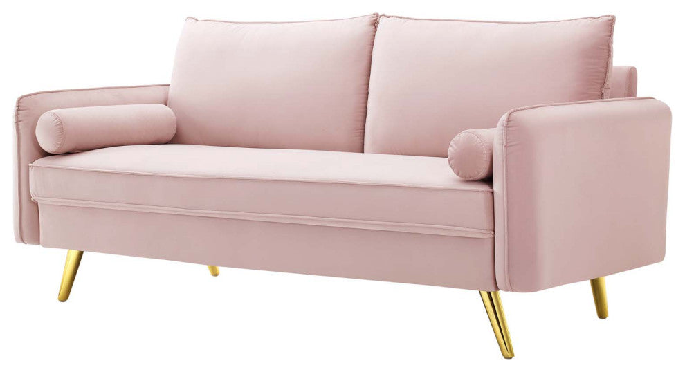 Give new vitality to your home or apartment living space with the Revive Upholstered Performance Velvet Sofa. With a comfortable yet tailored profile and two bolster pillows, this velvet sofa beckons guests to sit and stay a while. Its durable stain-resistant performance velvet upholstery grants this sofa an approachable appeal that�s echoed by its calming color, clean lines, and splayed gold legs. Arriving directly to your doorstep in a convenient shipping box, this upholstered sofa easily unpacks to quickly become the most well-loved lounge spot in your home. Sofa Weight Capacity: 1323 lbs.Contemporary Modern SofaPerformance Velvet UpholsterySplayed Gold LegsShips In A Convenient BoxNon-Marking Plastic Foot CapsWeight Capacity: 1323 lbsAssembly RequiredOverall Product Dimensions: 32.5"L x 72"W x 33.5"HSeat Dimensions: 21"L x 63"W x 17.5"HBackrest Dimensions: 63"W x 17.5"HArmrest Dimensions: 28"L x 4.5"W x 24"HBase Dimensions: 30"L x 61.5"WWeight (LBS): 77