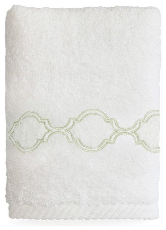 The Soft Twist Trellis Collection is our most luxurious yet, manufactured with more cotton per square inch to maximize both softness and absorbency. Timeless chain design embroidered in light green color thread on the finest 100 % Turkish cotton. These long-lasting towels are made with a thick twist and double stitched edge, and they become softer and softer with each wash.1 Washcloth (13" x 13") 100% Genuine Turkish Cotton Natural dobby weave border Machine washable Extra thick weave, 700+ GSM Made in Turkey Machine wash with-warm water, Tumble Dry Low, Remove immediately, No bleach