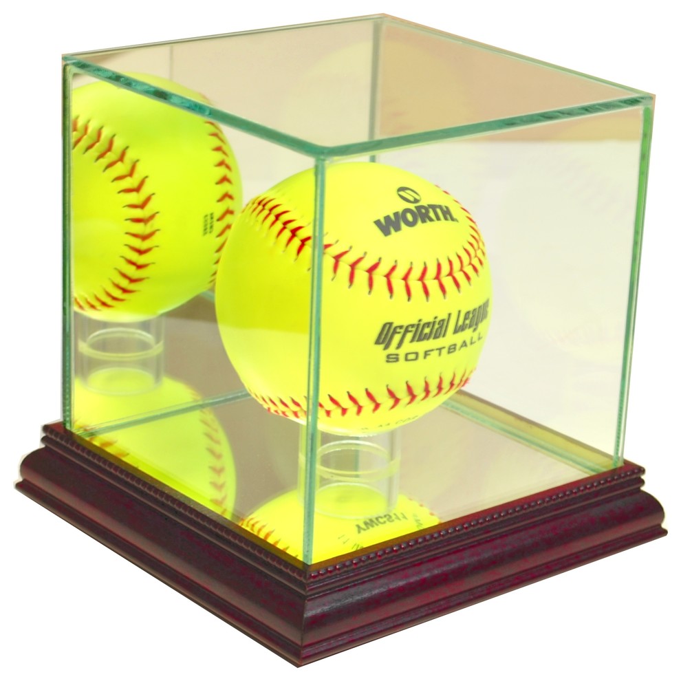 Protect your softball with our real glass Softball Display Case. This display case is made with mirror on the bottom and back to give a full view of your ball. This case is UV protected and is supported by real wood moulding. Our adhesives contain no acids that may deteriorate signatures. This case also comes with a clear acrylic ring to support your ball.