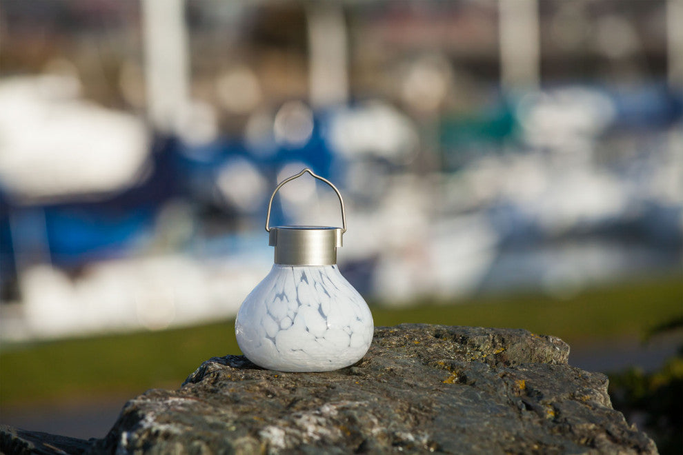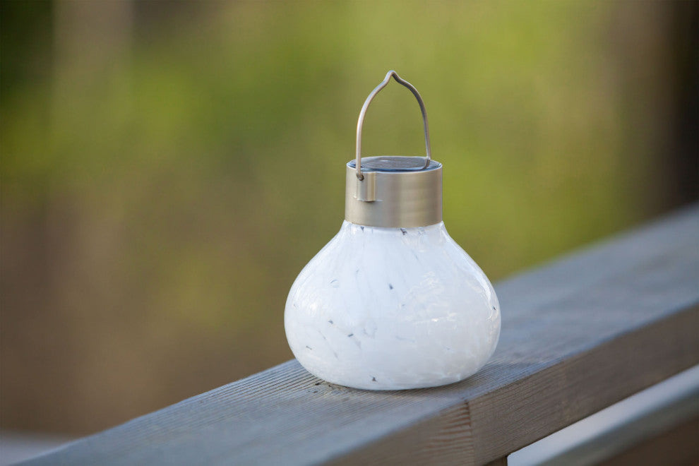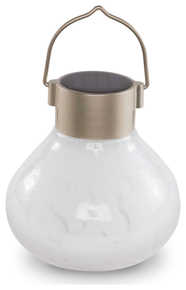 Catching the sun''s rays by day, our sweet NEW Solar Tea Lantern lights up by night to cast a warm romantic glow from within. Clean and quaint each hand-blown glass lantern is embedded with a combination of luminescence and white glass. Unlike other solar lights, this lantern utilizes a "warm white" LED, for a natural, inviting glow. For instant ambiance, add a little romance to every evening enjoyed outdoors!