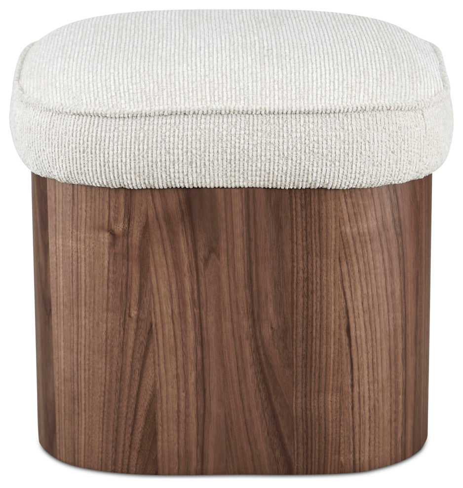 The Sonny stool elegantly articulates the luxury of simplicity with a walnut veneer base and a lift top that unveils discreet storage. Upholstered in flecked oatmeal fabric, the plush seat contrasts the wood''s solid nature with piping that traces its contours. Curved corners soften the stool''s silhouette, creating a serene yet functional piece.