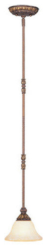 Enriching detail decorates the canopy, center gallery, and bobeche of this mini pendant. The vintage scavo glass is nicely matched with the crackled greek bronze finish with aged gold accents finish.