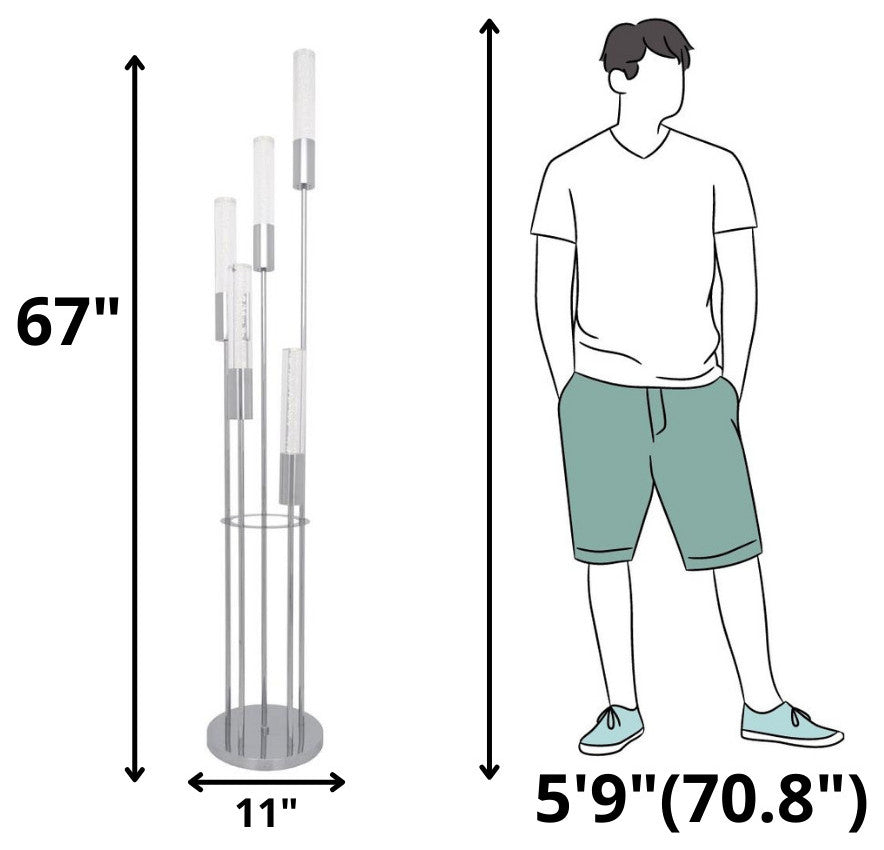 The components of an LED and the way that they generate light significantly extend the lifespan of these bulbs, generate high brightness and intensity, and extra savings with their energy efficiency. This floor lamp is made of aluminum and silicone with a height of 67 inches and weights 15 pounds. Five GU10 LED bulbs in an acrylic cylinder tube, 15 watts, 4000k and 1350 Lumens.