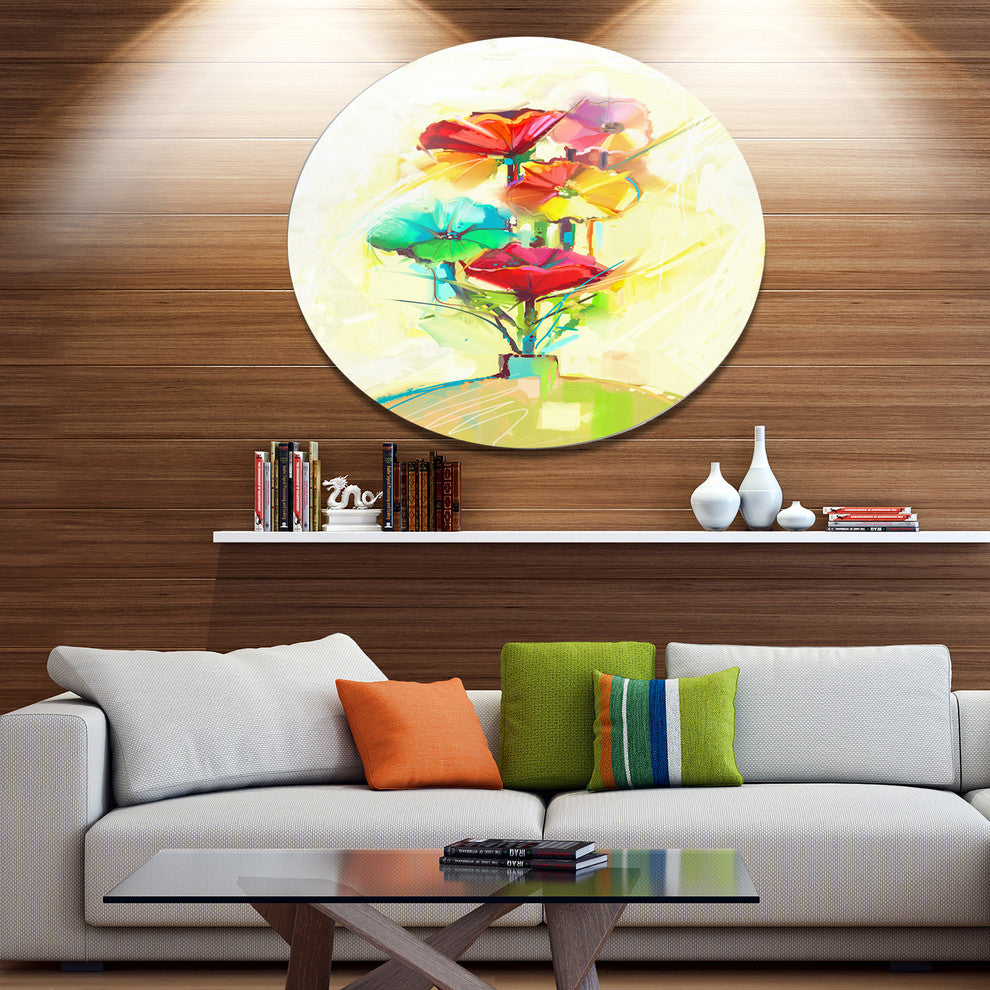 Bring Contemporary Abstraction to your home with this large Circle Metal wall art. This Spring Flowers Bouquet in a Vase Metal Artwork makes it the focal point of any room or office.