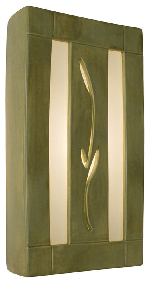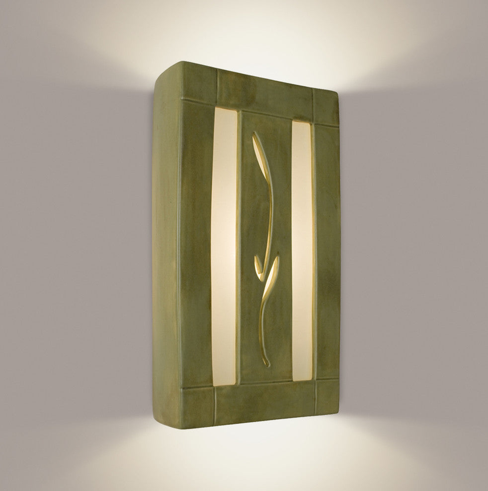 This one-of-a-kind wall light integrates fused art glass made from reclaimed window glass and kiln-fired glazed ceramic. The White Frost art glass creates a warm glowing backdrop highlighting a simple floral design hand-cut into a Sagebrush glazed ceramic frame. Light shines through openings at the top and the bottom of this rectangular fixture with gently curving sides. Subtle color and texture variations are the hallmark of a truly handcrafted piece of art.