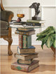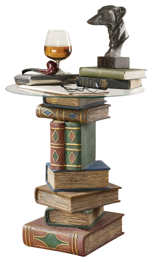 • Note• Accessories not includedBe "book smart" with this artistically sculpted table that speaks volumes! With a penchant for the literary, this quality designer resin, 360-degree sculptural work of decorative art is hand-painted with faux leather covers, then topped with a 3/8"-thick, pencil-edged glass top to be admired from all angles. 18.5"diam. x 20.5H. 28 lbs.