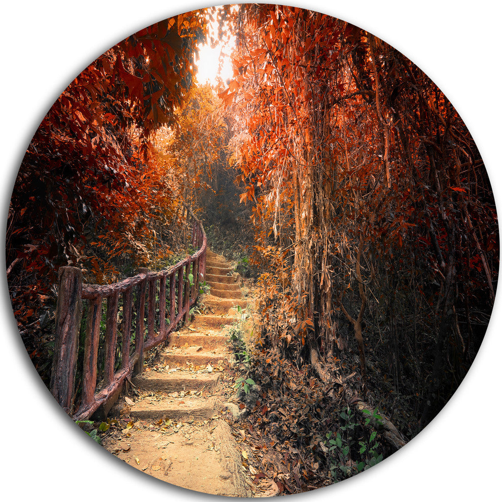 Bring Contemporary Abstraction to your home with this large Circle Metal wall art. This Stairway Through Red Fall Forest Metal Artwork makes it the focal point of any room or office.