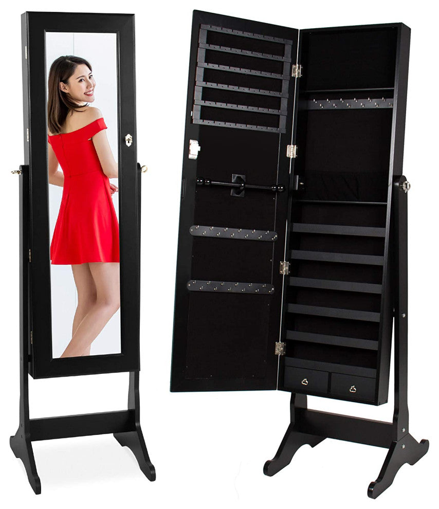 Standing Mirror Armoire Velvet/25%.Imported. Includes 48 necklace hooks, 2 cubbies, 6 lined shelves, and a bracelet rod, with ample room for storing rings and earrings.Built with a sturdy base that can be tilted to 3 different angles by utilizing the 2 sticks and 3 horizontal holes on its legs to give the best head-to-toe view of your outfit. A stylish velvet interior protects jewelry from scratches, and the lock and key keeps everything safe and secure. Fits nearly anywhere, including in the closet or as a decorative display that compliments any decor style. This armoire adds an elegant touch to any bedroom, powder room, or sitting room, and comes in a variety of colors to best match your ambiance; Overall dimension: 18.5"(L) x 18"(W) x 61.5"(H); Weight Capacity: 33.1 lbs.