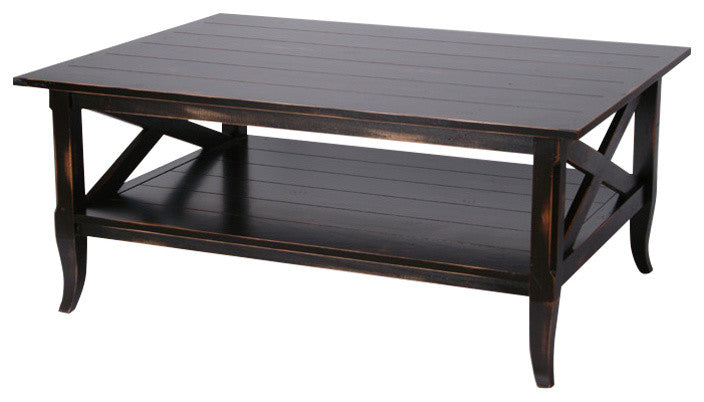 Kick up your feet and relax with this Stanton Coffee Table. Featuring a distressed black finish, this stunning table is ideal in any traditional-style home. This table measures 48 inches wide by 36 inches deep by 21 inches tall, the perfect size for displaying books and flowers, gathering friends around for board games, and even enjoying a casual weeknight dinner and some Netflix. Made in USA.