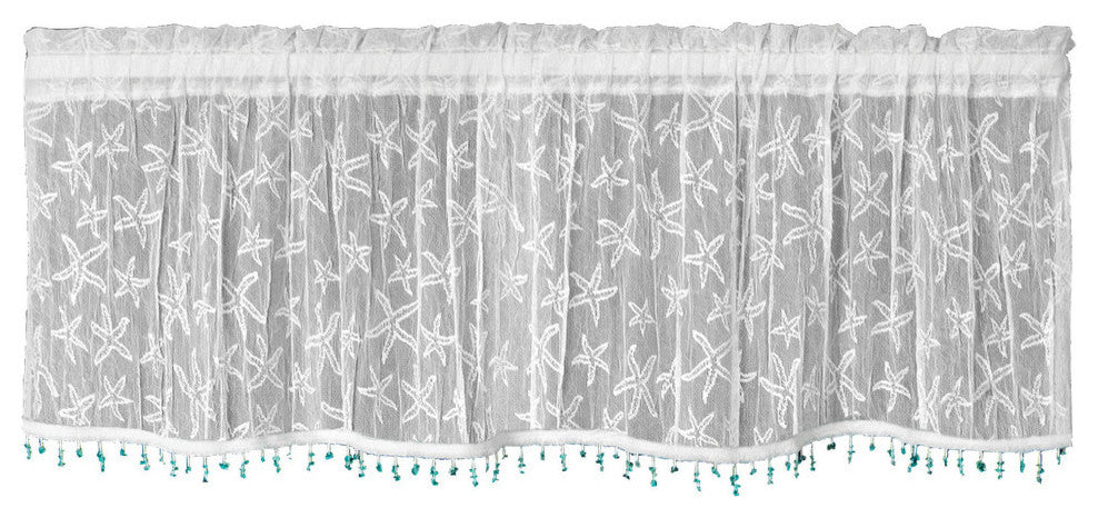 Beachy clean. An airy seaside theme brings summer home year round. Fabric has been crushed which gives it that soft lived-in feel. The shorter lengths are trimmed with a decorative aqua sea glass trim. Made in the U.S.A. 100% polyester; exclusive of decoration. Made in U.S.A. Trim (if applicable): 80% glass, 20% cotton. Assembled in the U.S.A. from U.S. and imported components. Hand wash in cold water with mild soap. Do not bleach. Lay flat or hang to dry. Ironing is not recommended. 1" Header 1.5" Rod pocket 1" Sea glass trim included in finished length Fine-gauge lace