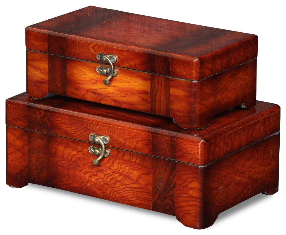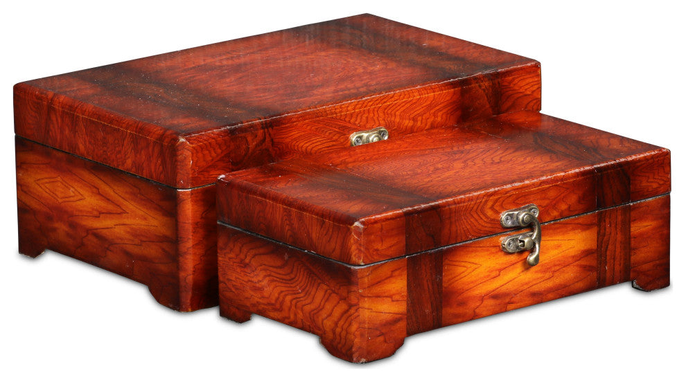 Reminiscent of antique steamline luggage, these Steamline Wooden Nesting Boxes share a similar design to the charming travel classic. A lovely addition to your bookcase or mantel, these wooden boxes are the perfect place to store anything from books and jewelry, to childhood photos. Sold as a set of two, these nesting boxes make for easy and efficient storage. A brown trim running down the left and right sides of the boxes provides the antique luggage look, while an interior lining and metal hook latch ensure the contents of each box stays safe and secure. A gorgeous complement to your traditional home decor, the Steamline Wooden Nesting Boxes are equally as stunning when used as purely decorative pieces. Dimensions:Large: 10.5"x6.5"x4"Small: 8.5"x5.5"x3"