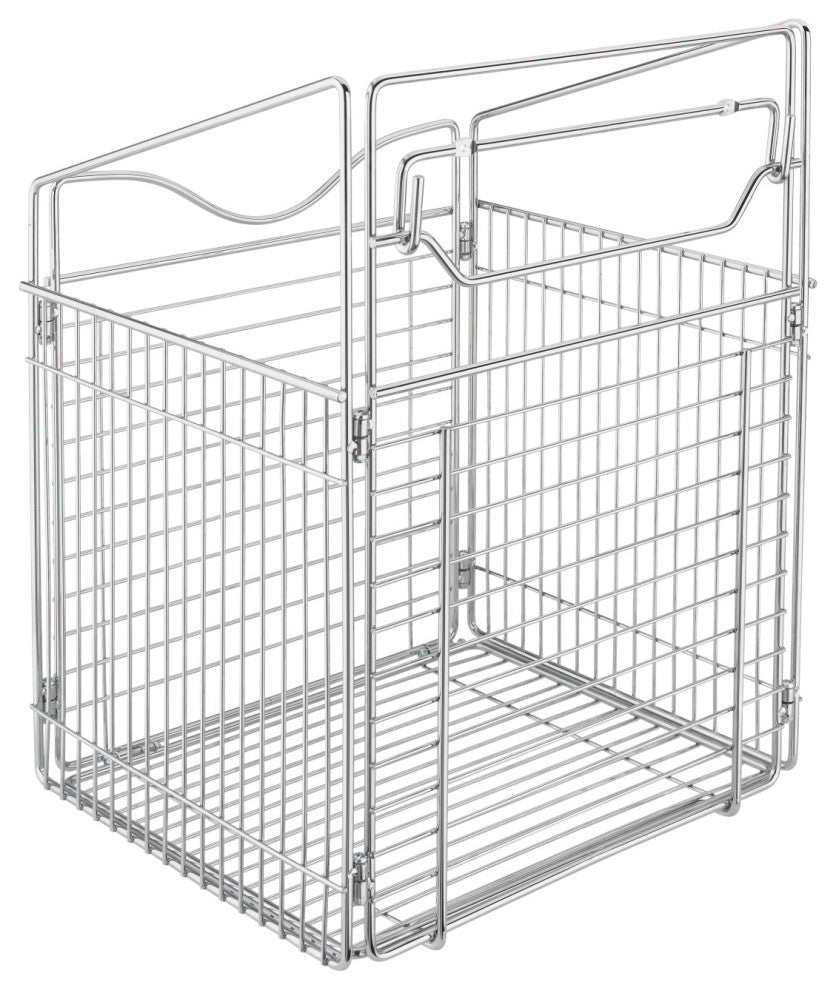 Now you can conceal and access laundry in one easy motion with the Rev-A-Shelf Tilt-Out Hamper. Simply door mount the basket hook to a bottom hinged cabinet door (hinges not Included:) for easy one step removal when needed. The series is available in two sizes and multiple finishes to match your current closet hardware or design. Each is constructed with durable 6.6 mm wire and feature capacities of 1.7 bushels (55 Quarts) for the 16" wide unit, and 2.3 bushels (74 Quarts) for the large 21" unit. Note: Hinges are not provided due to the variety of hinges available and closet construction will determine the required hinge.-Included: (1) Chrome hamper basket only and door mount hook-1.7 bushels of capacity (55 quart)-Basket is removeable-Door hinges are not Included: due to variety of cabinet styles, construction and hinge variety available-Optional Flap Stay is available (CTOHBSL-FS-1) (Sold Separately)-Designed for 14" or deeper closet system-Black Hamper Liner available and sold separately CTOHB-16-I-1-Construction: Heavy gauge plated metal wire construction