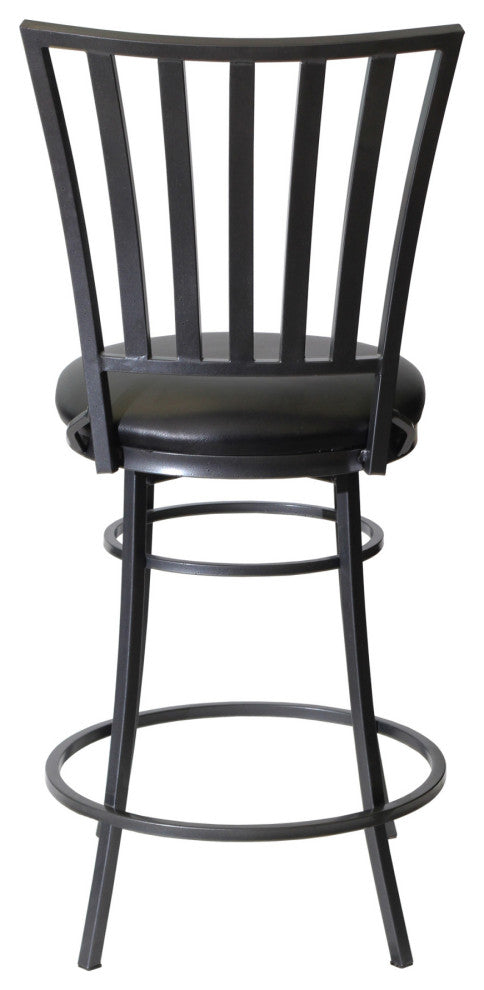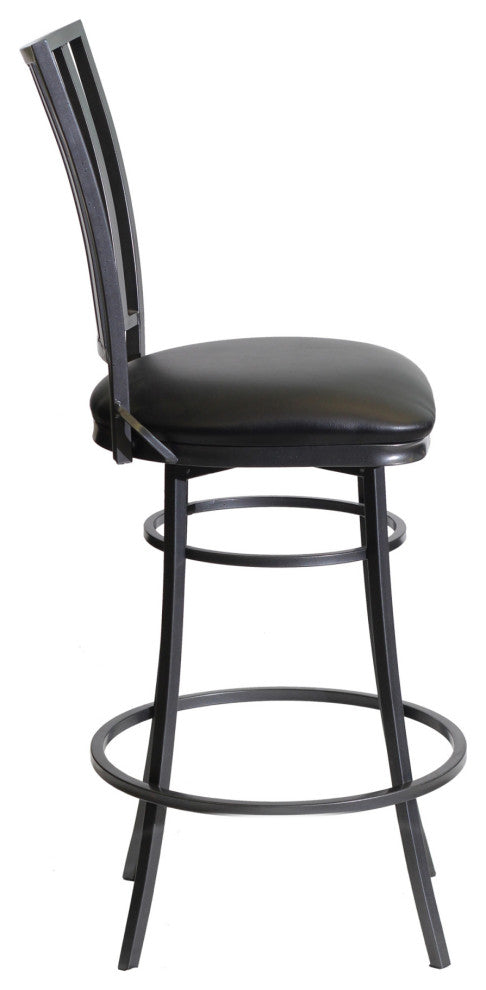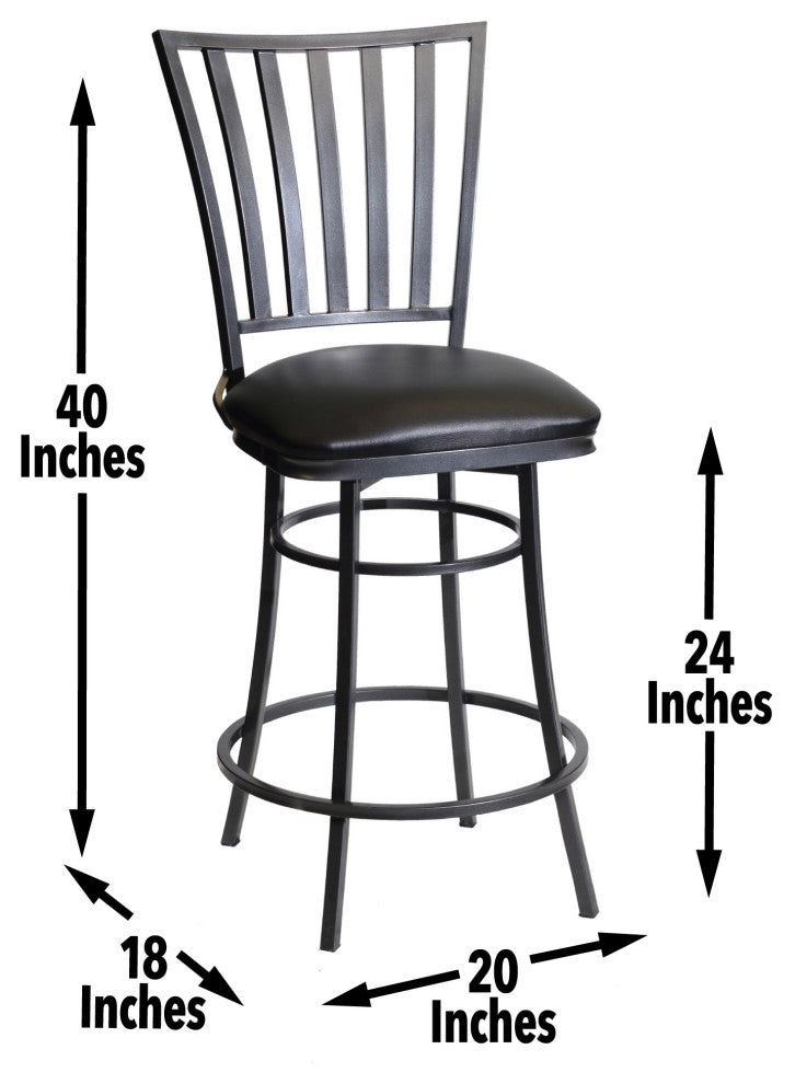 Comfort, style and durability in a Commercial Grade strength Bar Stool, Stellan adds some mixed media style to any counter area. A sleek powder-coated gunmetal finish mixes beautifully with the super comfortable midnight leatherette upholstered seat. The full 360 degree swivel seat makes entrance and exit easy as well as enjoyable. This 24" seat high chair works with any 36" counter including Bar counters.