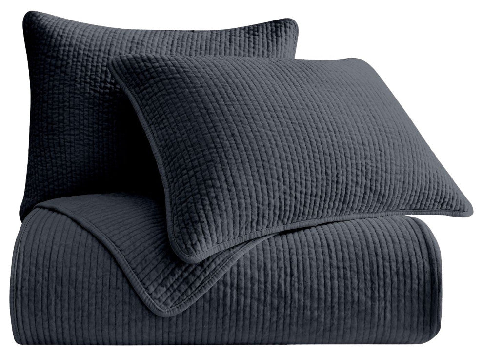 Irresistibly soft and cozy, this quilt brings a warm, lived-in charm to any room. Our stonewashed cotton velvet quilt has a substantial hand and easy drape, accentuated by channel quilting for a simple yet modern look. Durable and easy to care for, this quilt acts as a lightweight standalone piece for warmer months but transforms into a versatile layering element during cooler months. Its availability in a wide range of neutrals and jewel tones means there''s a sumptuous quilt for your style, whatever that may be.What''s Included1 Quilt and 2 Pillow Shams DimensionsQuilt: 110"W x 96"L; Pillow Sham: 21"W x 34"LMaterialsFace and Back: 100% cotton; Fill: 100% polyesterCareMachine wash cold, gentle cycle only, do not bleach. Tumble dry on low heat, iron at low setting. Do not dry clean.Inserts available separately.