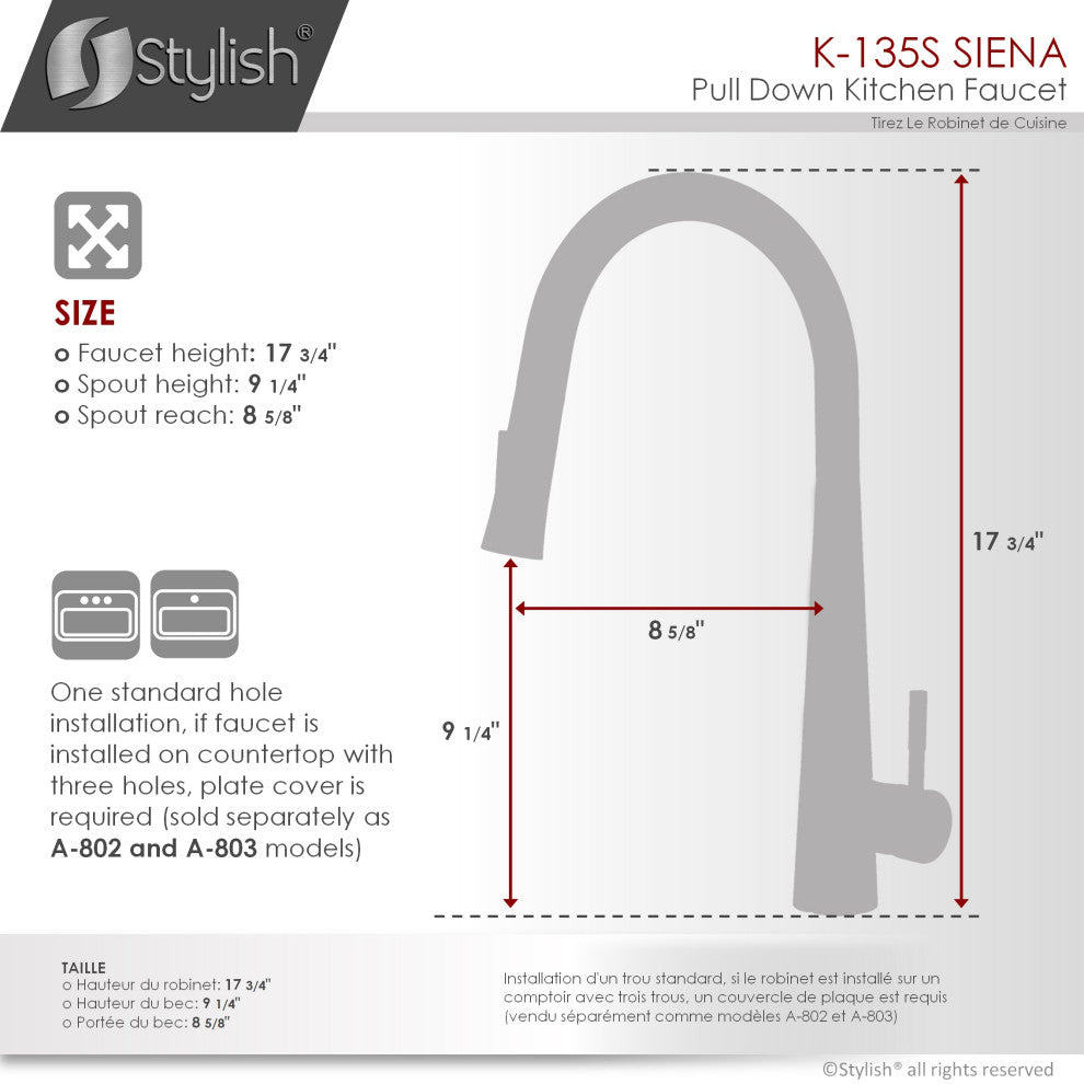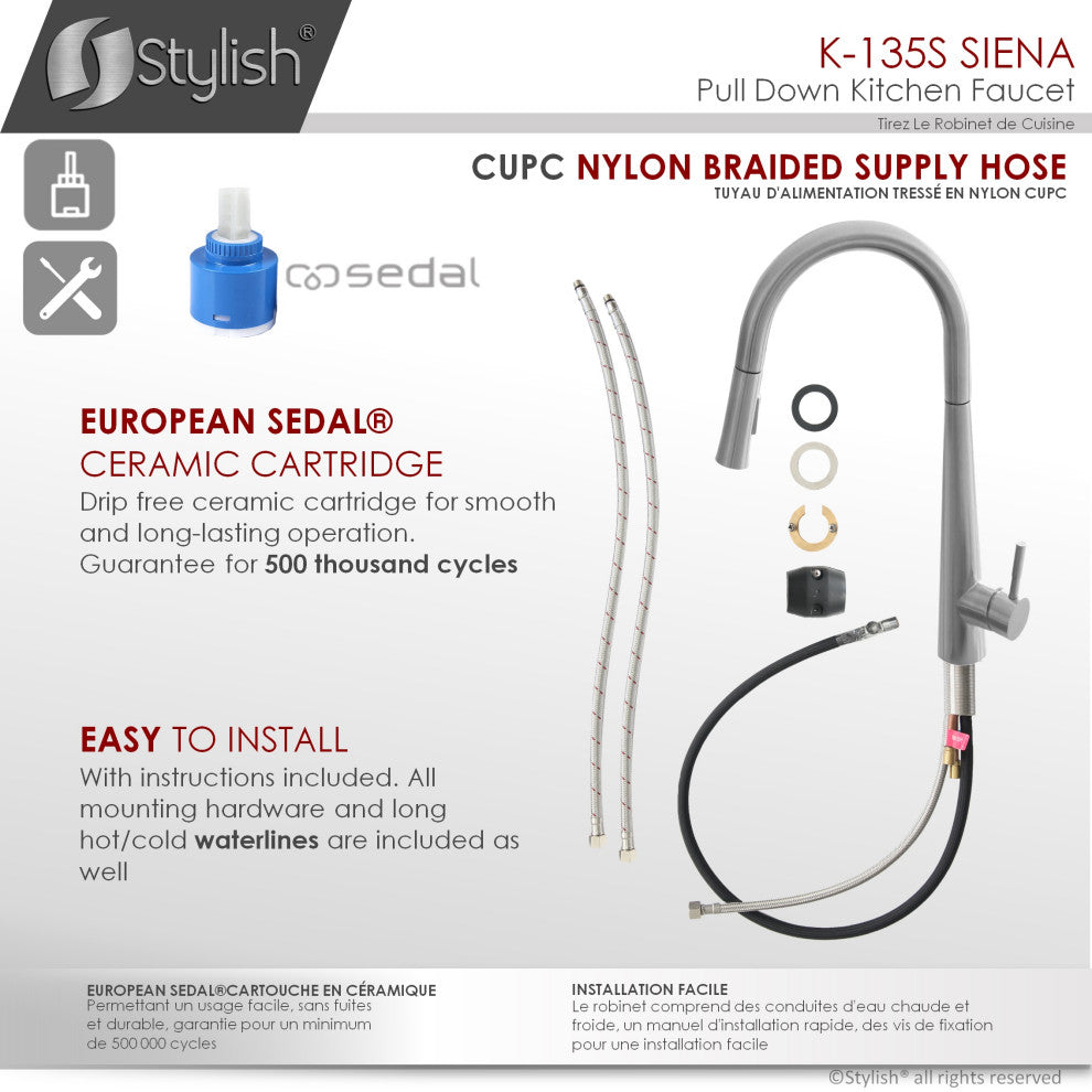 The K135-Siena faucet by Stylish. This faucet is made of 100% stainless steel and has been manufactured with top-quality components in order to ensure superior performance and durability. With a streamlined design and flexible functionality, this pull-down faucet is the perfect fit for your kitchen. The sleek lines and soft curves create a beautifully balanced silhouette that suits a range of styles, from classic to contemporary. This versatile faucet features an ergonomic pull-down metal spray head with magnetic retraction system and a single-lever handle for effortless flow control. The dual-function sprayer with flexible and swivel hose switches between aerated stream and powerful spray mode. To ensure long durability and reliable drip-free use, Stylish K135-Siena faucet comes with European ceramic cartridge, including a high-performance water-efficient aerator. This beautiful and elegant pull down kitchen faucet will bring a touch of minimalist style to your kitchen. FEATURES: FOUR FINISHES:"¯Available in Brushed"¯Stainless"¯Steel (K-135S), Matte"¯Black"¯(K-135N),"¯Polished Chrome (K-135C) and Brushed Gold (K-135G) ELEGANCE MEETS QUALITY:"¯Made of 100%"¯stainless"¯steel,"¯our kitchen sink faucets are ready to withstand everyday tear and wear. Worry no more about rusty parts and nasty corrosion. Worry no more about dripping faucets either."¯"¯ METAL AND MAGNETIC DUAL FUNCTION PULL-DOWN SPRAYER:"¯switches easily between stream and spray mode."¯Easy to operate and retracts effortlessly MAXIMIZE FUNCTIONALITY: Its 360° swivel spout head rotation offers additional functionality to ensure a better range of motion and complete sink access. PULL DOWN SPRAYER: Faucet is designed to accommodate even your most demanding kitchen needs. The pull-down spray head has a swivel connection to spray head for best ergonomic operation. REDUCE WATER WASTE:"¯Thanks to its"¯built-in"¯high performance low/flow"¯aerator, this sink faucet reduces water waste without ever sacrificing pressure. Wash your dishes easily from now on. Clean fruit and vegetables effortlessly."¯"¯ SMART SINGLE HANDLE CONTROL:"¯The handle can move up to 90° towards the front to allow ample range of motion and avoid interfering the backsplash."¯ EASY-CLEAN:"¯Rubber nozzles guarantees quick limescale removal."¯ 100% STAINLESS STEEL:"¯Durable stainless steel solid construction."¯The best option for clean drinking water. SEDAL CERAMIC CARTRIDGE:"¯For reliable drip free use; tested for over 500,000 cycles."¯ HOSES: Long cold and hot water hoses included, not need of extra hardware for installation. GET THIS SINK FAUCET WITH A LIFETIME WARRANTY:"¯Since your satisfaction is our top priority, this"¯stainless-steel"¯sink faucet is backed by our unconditional LIFETIME warranty policy! In the unlikely event of ever having any issues with it.WARRANTY: This product is covered by a Limited Lifetime.