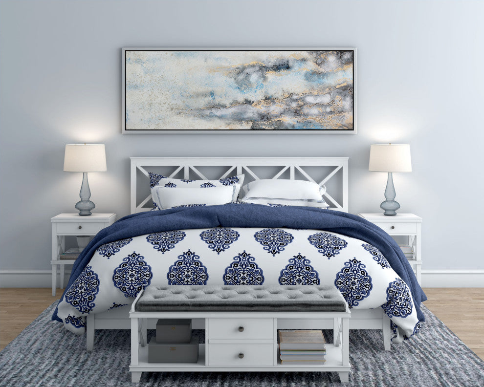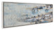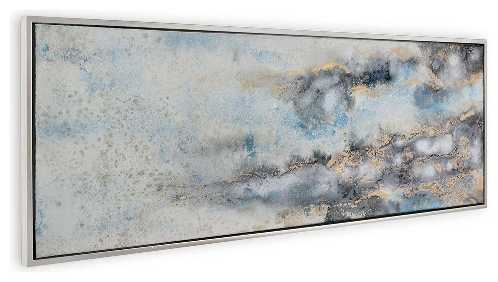 Get lost in this hand painted abstract featuring calming blue and grey hues that are subtlety accented using gold leaf. Framed with a silver floater frame, this artwork is the perfect size for over your bed or sofa.