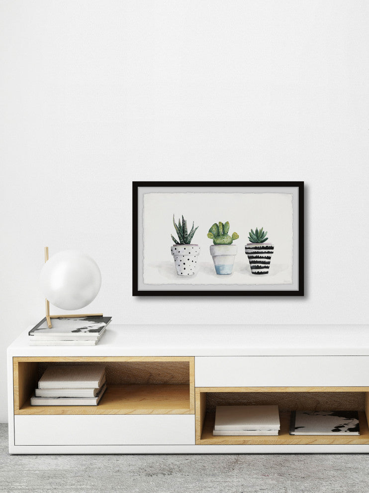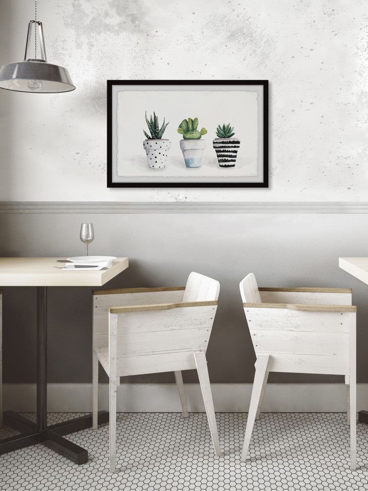 This eye-catching watercolor painting print features three succulents in various patterned pots. Proudly printed in the USA, this piece is printed on high quality archive paper and professionally hand-framed. With wall-mounting hooks included, this artful accent is ready to hang up as soon as it reaches your front door.