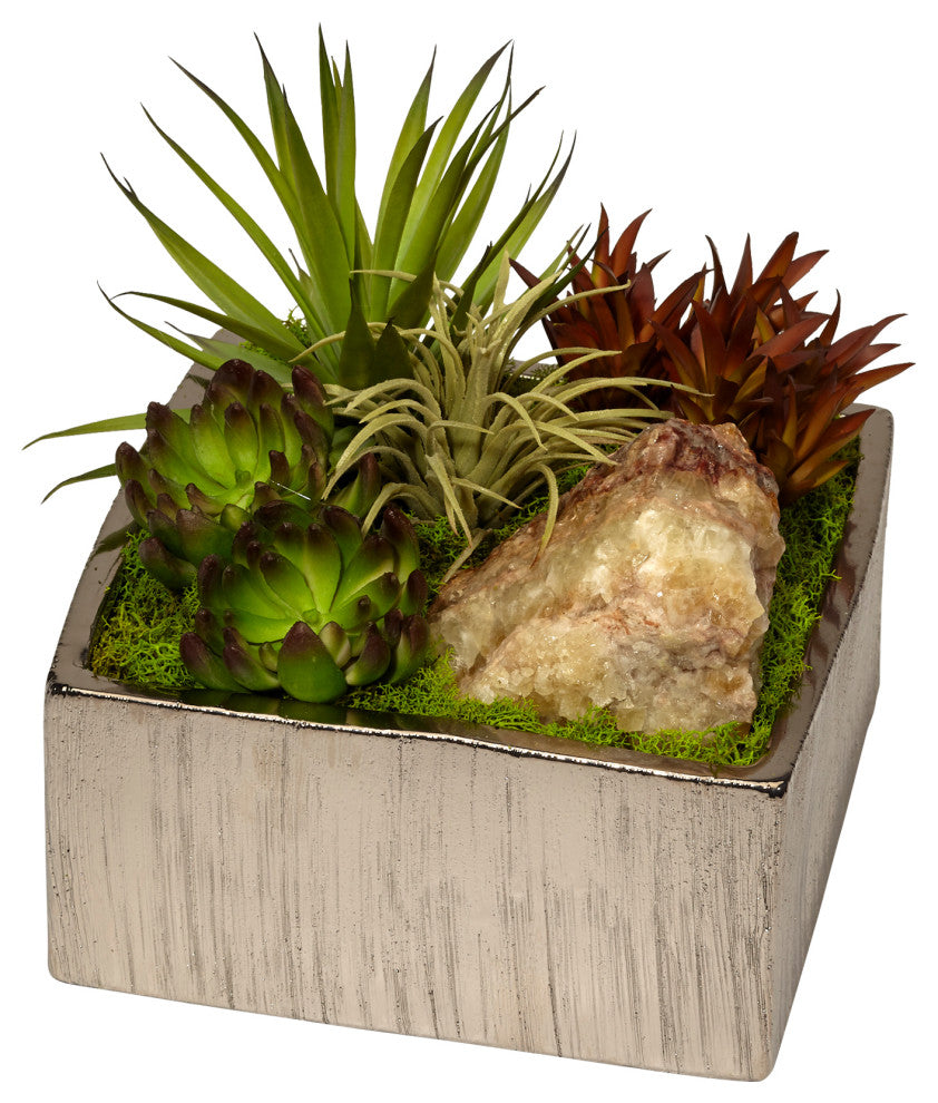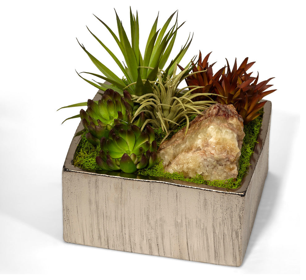 succulents from different textures and sizes gathered into a silver square container and finished with a beautiful piece of emerald green calcite and preserved mosses.