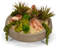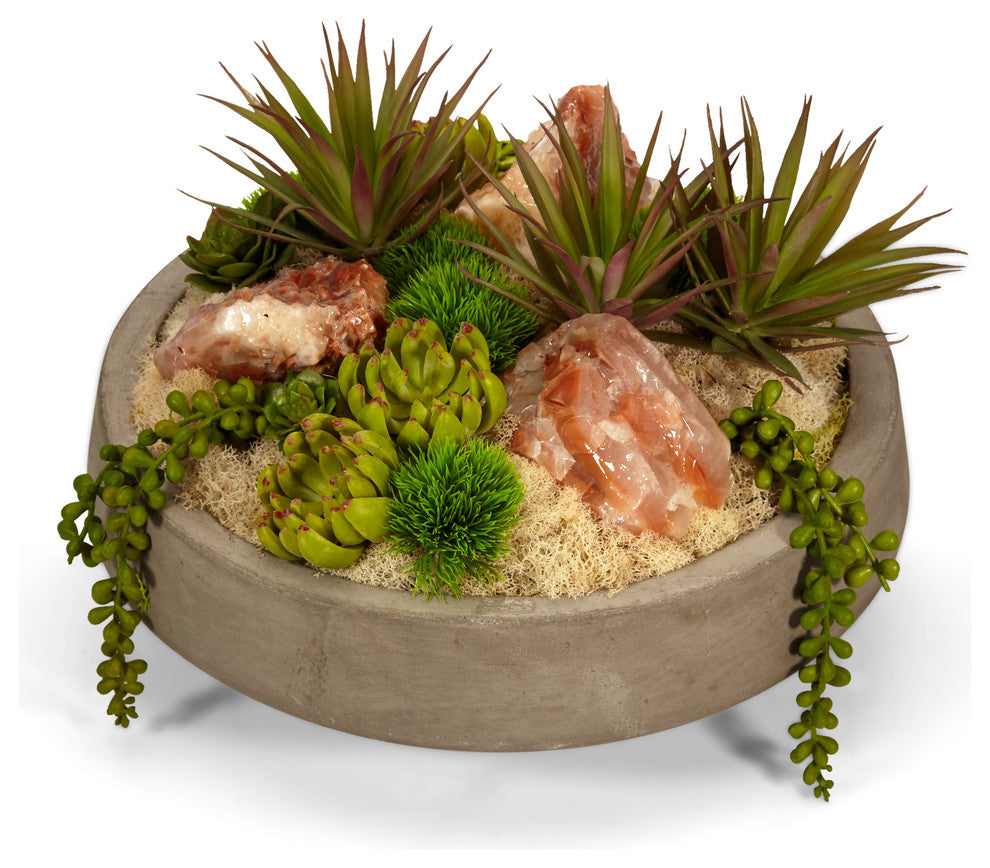 succulents and red calcite in concrete bowl