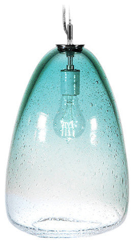 Illuminate your environment with this contemporary twist on a classic shape. Featuring seeded hand blown glass, the Summit artisanal lighting pendant is available in an assortment of decorator colors to complement your home. 8" W X 14" H; 5" canopy. 60w; 120v. Edison-style filament bulb included. Ships with 6 ft. of electrical cord. Made to order.