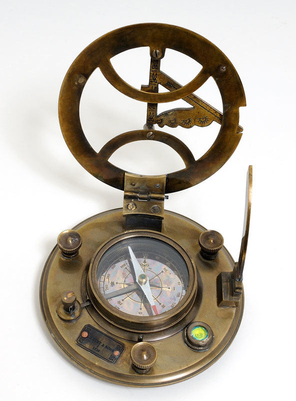 This is a fully functional sundial compass. It is made of high quality brass. Each component is crafted with the finest craftsmanship. Contains a foot screw and circular bubble for easy reading. The lid is fixed with a hinge. Available in antique brass finish and comes with a beautiful rosewood gift box. This compass is a great addition to any nautical collection. The item dimensions are: L: 5 inches, W: 5 inches, H: 4 inches.
