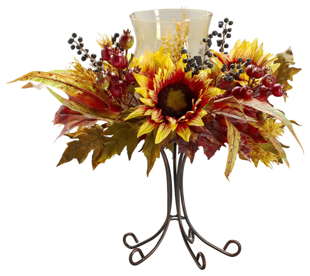 Warm your holiday heart with this stunning Sunflower Candelabrum. Stranding proudly at 16tall, this candelabrum will dance with delight, whether there''s a flickering flame present or not. And the metal stand? Elegant as can be. Looks great on a mantle, a bookcase, or as a centerpiece. Also makes a great gift.