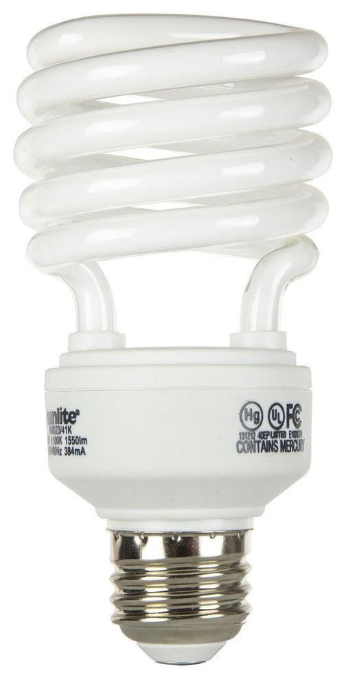 Sunlite super mini spiral compact fluorescent lamps fit into most standard fixtures and give off a cool white light much like a 100 watt incandescent bub. These energy efficient CFL lamps can last up to 9.1 years with normal household use of 3 hours a day. This energy saving 23 watt 4100K, medium base bulb offers 1600 lumens of light output and has an average rated life of 10,000 hours. Great for floor lamps, desk lamps, ceiling fixtures and most common household lighting needs.