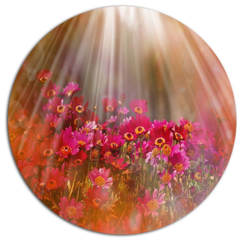 Sunrays Over Little Red Flowers, Floral Disc Metal Artwork, 11"