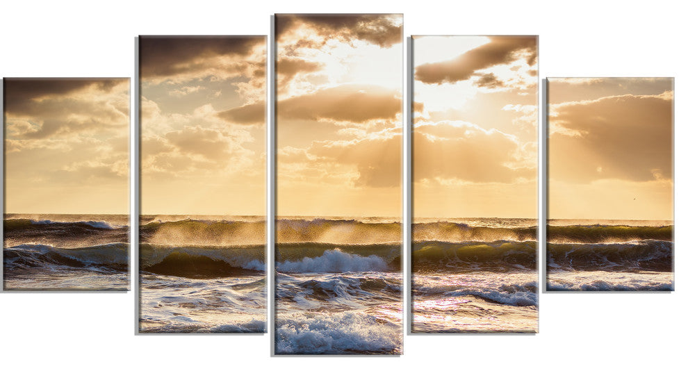 "Sunrise and Roaring Blue Sea Waves" Beach Canvas Wall Art, 5 Panels, 60"x32"