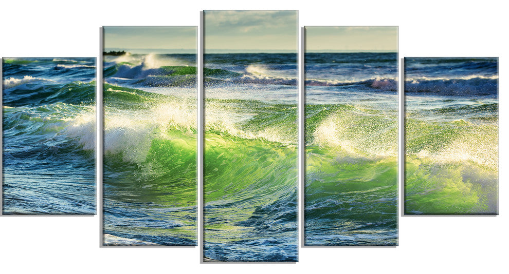 "Sunrise And Shining Waves in Ocean" Beach Canvas Wall Art, 5 Panels, 60"x32"