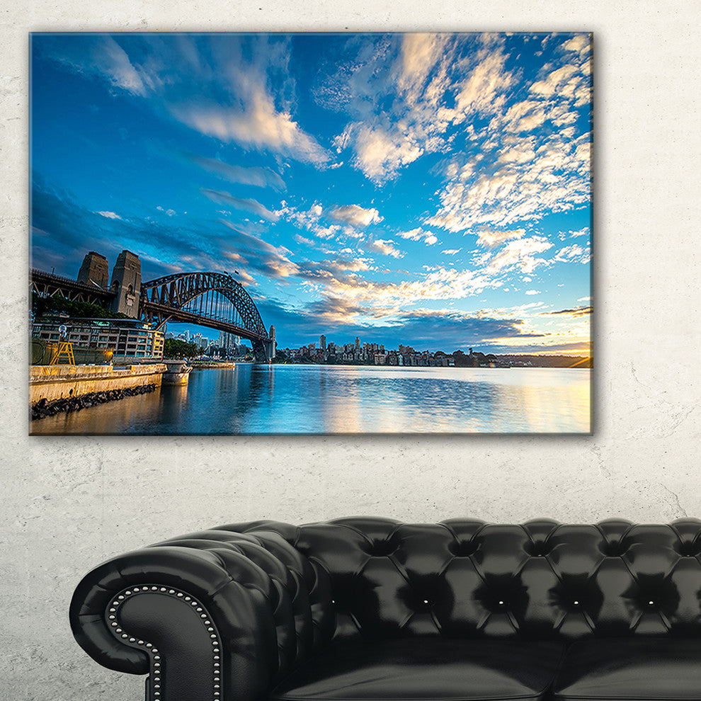 The Sunrise from Sydney Harbor Bridge canvas art print is sure to make an impression on anyone who sees it. This artwork is gallery wrapped around a 1-inch solid wood frame and arrives carefully packaged and entirely ready to hang on the wall. Design Art only uses the highest resolution and pigments to ensure a crisp colorful print that is never faded or pixelated. This artwork is sure to be a conversation starter in any home or office.