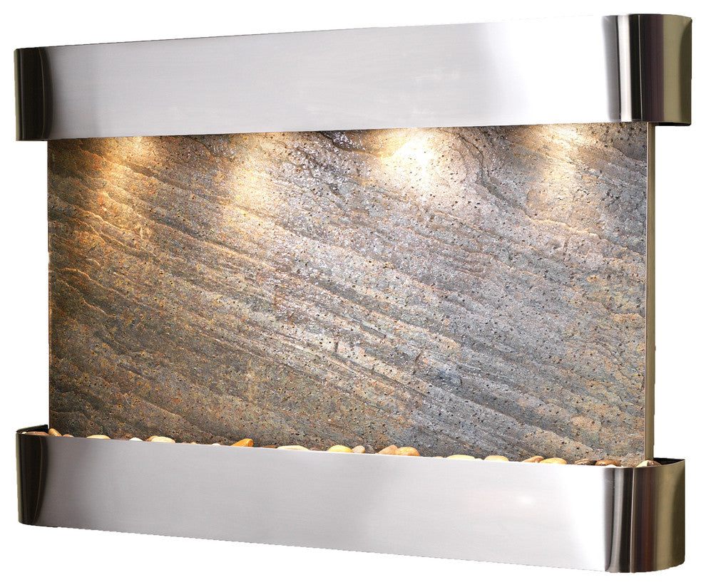The Sunrise Springs water fountain by Adagio Water Features is perfect for over a sofa, table, potted plants, or desk. The soothing sounds it creates will help relax you after a long day at work or play. Flowing water calms all who hear it from the very young to the young at heart. Simple assembly and maintenance makes this wall fountain perfect for any home.52" L x 35" H x 6" D, easy to hang, complete with colored instructions and hardware for hanging on a sheetrock wall. Hanging Weight 100 lbs. This unit includes: 4 halogen lights Polished river rocks Electric pump 3-way pull chain that allows you to run just lights, just water, or lights and water. Welded plastic liner insures against leaking and unique water distribution unit system will not clog. 110V, 100W; one cord operates entire unit; 90 degree plug can be concealed behind water feature. Durable powder coat finish; Manufactured and assembled in the USA with a 1 year limited warranty. • This light-weight slate veneer known as FeatherStone is natural stone and therefore may differ in color and texture from the photos shown.