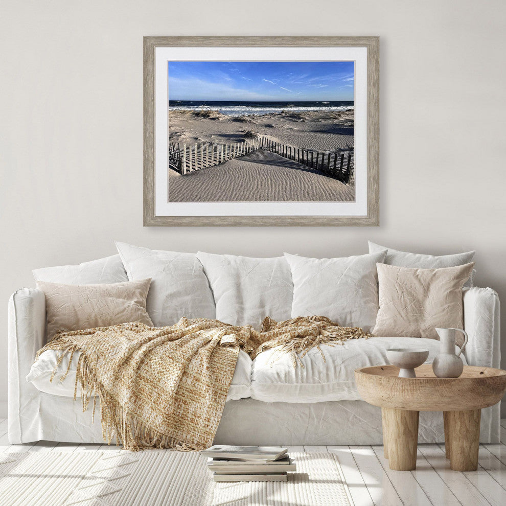 A late afternoon sunset is double matted in white and putty. Framed in a distressed silver finish molding with a combed embossed pattern.
