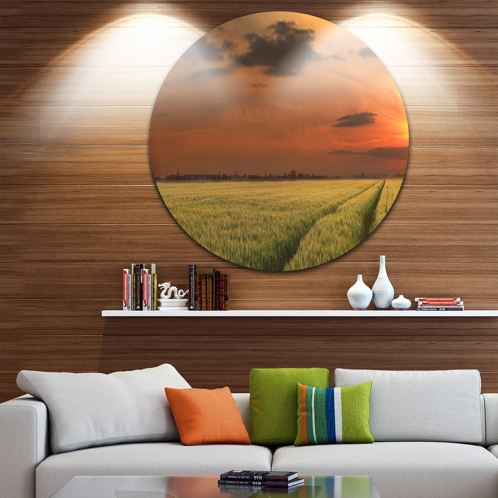 Bring Contemporary Abstraction to your home with this large Circle Metal wall art. This Sunset over a Field of Cereals Metal Artwork makes it the focal point of any room or office.