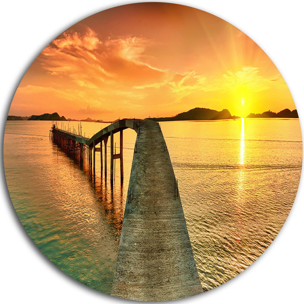 Bring Contemporary Abstraction to your home with this large Circle Metal wall art. This Sunset over Pier Panorama Metal Artwork makes it the focal point of any room or office.