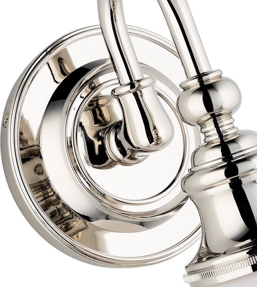 The alluring shape of vintage lighting is a complement to its meticulous fabrication. Sutton''s tube-shaped arms and opal glass shades draw on the strong, yet graceful Style of gas-lit originals.IlluminationBulb Type: E26 Medium Base - A19 Bulb# of bulbs: 1Max Wattage/bulb: 100Bulb(s) Included: NoStyleFinish: Polished NickelCollection: SuttonWire/Cord Length: 6"Material: MetalAdditional InfoVoltage: 120Weight: 3 lbs.Lighting fixture is rated for Damp Location