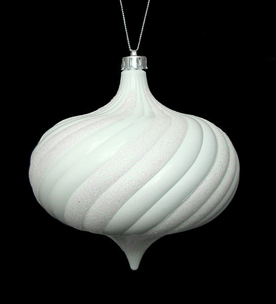 White Swirl Christmas Onion Ornament SetItem #COP10282-4WHT4-piece set Color: Winter whiteFeatures:These dazzling ornaments are accented with sparkling glitter swirlsThis special set will allow you to build your collection quickly and decorate with more possibilitiesShatterproof ornaments combine the beauty and luster of real glass with the unbreakable practicality of plastic Onions are equipped with silver ornament caps and come ready-to-hang on silver cordsDimensions: 5.75" high x 5.75" diameterMaterial(s): Plastic/glitterPack includes 4 of the item shown