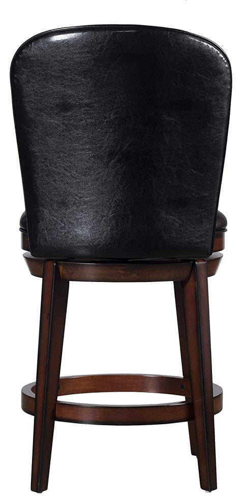 This Swivel Counter Height Stool is simple in design creating a style that''s versatile enough to match any décor. Its Dark Chestnut wood finish and Black faux leather combination are as classic as it comes. While its sleek silhouette makes it an excellent addition to any design scheme. The padded seat with 360° swivel also features a contoured upholstered back and perfectly placed footrests for added comfort. Ideal for your kitchen island or counter height dining table. Assembly required.- 100% Polyester- Sleek shape and design- Solid hardwood construction- Black vinyl seat and back- Chestnut finish- Dimensions : 42.25H x 19.5W x 23D, Seat Heights : 26"