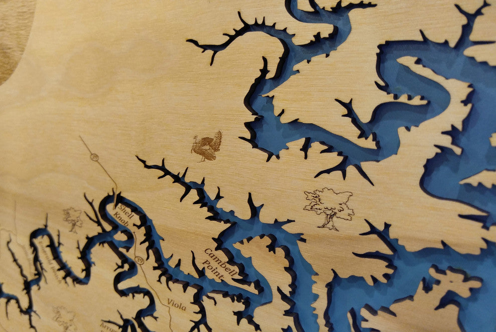 This is a beautifully detailed, laser engraved and precision cut topographical Map of Table Rock Lake, Missouri with primary inflows from White River, James River and Kings River, with the following interesting stats carved into it:
