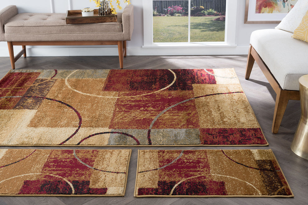 Asperous tiled hues and circular motifs combine to create a lively area rug that translates to any decorating style. In shades of red