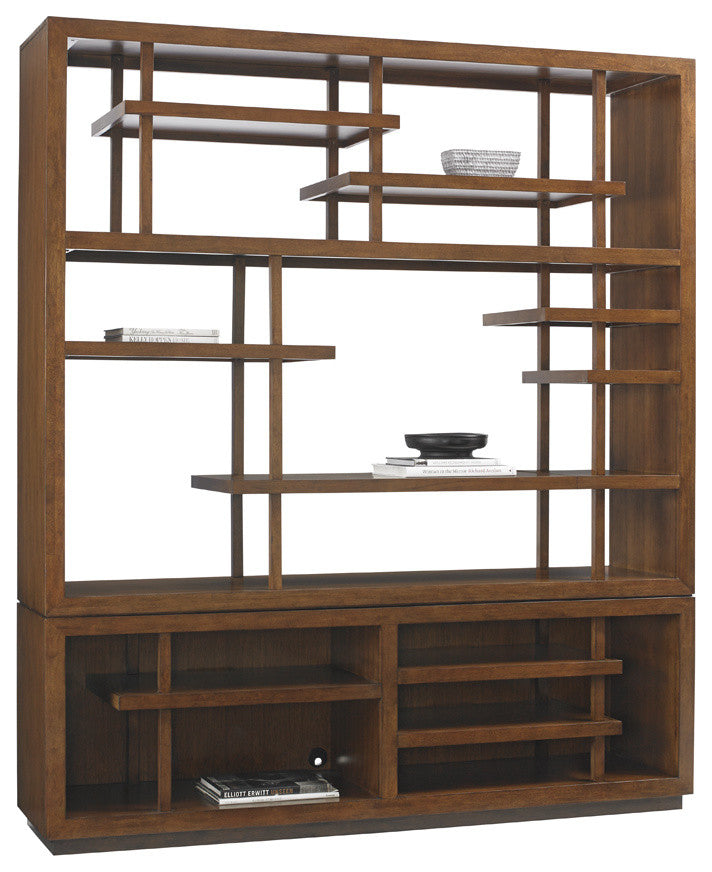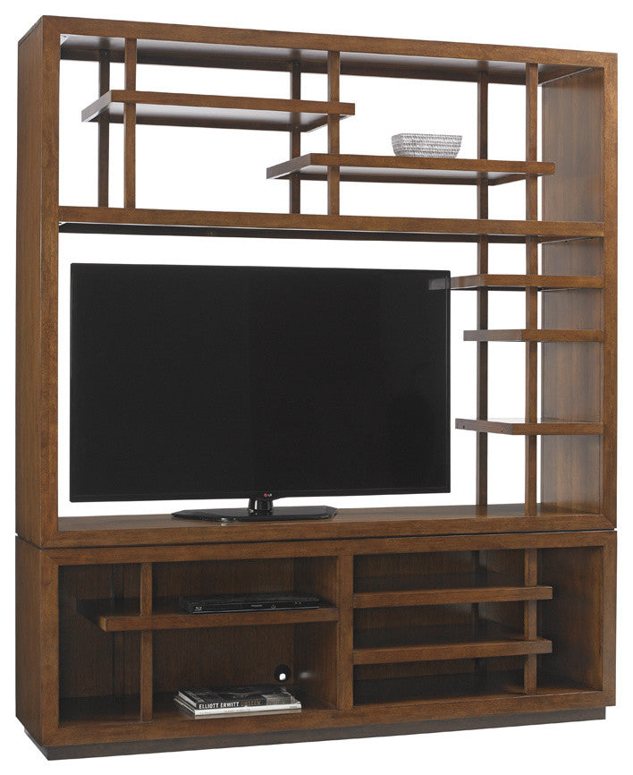 Configurable asymmetrical horizontal and vertical partitions make a grand statement without compromising function. The Pan-Asian styling consists of two main sections. The upper section consists of six stationary shelves and two removable shelves and posts. The lower section has three stationary shelves and grommets for electrical cords. A TV compartment can be created measuring 57.25 inches wide and 37.87 inches high.