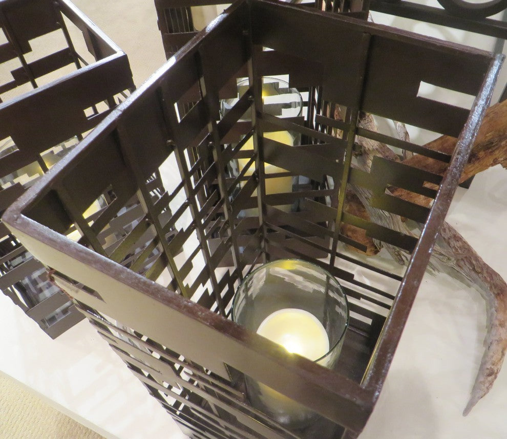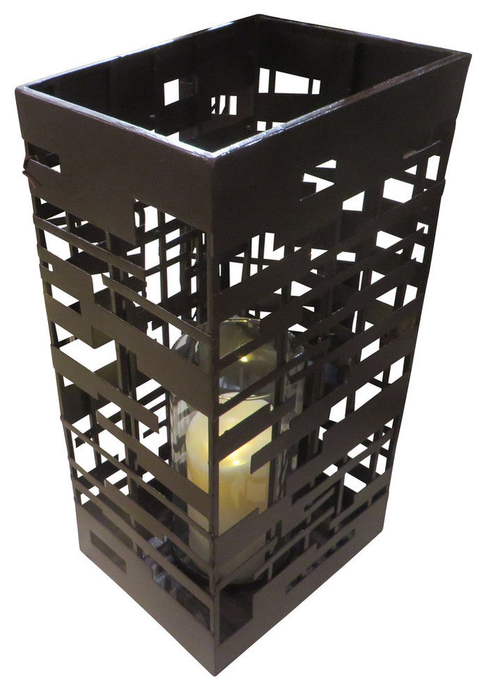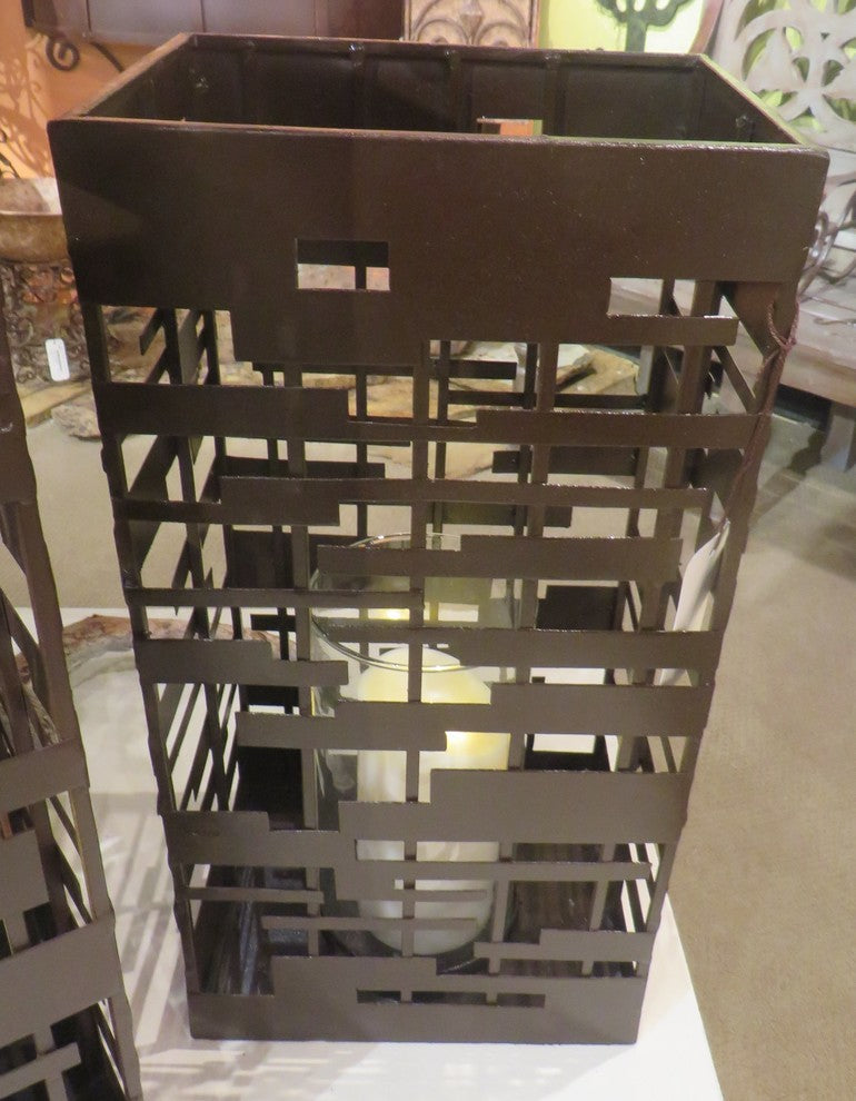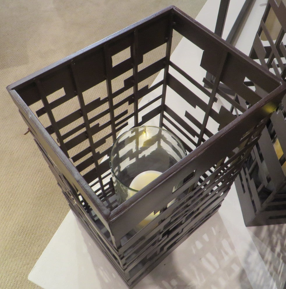 With their stunning geometric design, our Escher candleholders are beautiful contemporary accents. Perfect for large pillar candles, they''re sturdy enough to be used even outdoors on the patio. When used with lit candles, they give off a beautiful, warm light. Handcrafted of iron with rich dark brown finish. 10" glass hurricane included (candle sold separately)Available in three sizes (each sold separately) - use different sizes in a group for a stunning look. Use indoors or outdoors. Please note that it will develop a natural patina over time if exposed to the elements. Size: 24'''' H x 10'''' W x 8'''' Deep Weight: 16 lbs. Heirloom Quality - Expertly hand crafted and hand finished Due to the hand crafted nature of this piece, each piece may have subtle differences.
