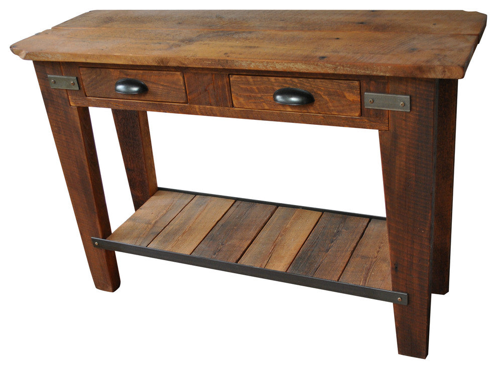 This handmade side table has clean lines, with a classically-inspired two front drawers. It is 49 inches wide, making it an ideal solution for any spaces in the living room, bedroom, hallway, or wherever you need it. The solid reclaimed wood frame is finished with few metal bar accents. Perfect for entry table, bathroom table or living-room addition. Table is made out of dark brown reclaimed wood with two metal bars.