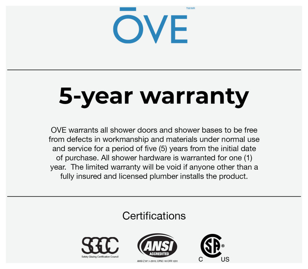 Includes 5-year warranty on glass panels and pan, and 1-year warranty on hardware. Warranty requires installation by fully insured and licensed plumber.
