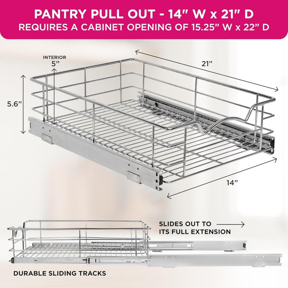 HEAVY-DUTY GAUGE WIRE: Made out of heavy-duty metal with an extra smooth sliding system to accommodate a large number of pots and pans.SMOOTH SLIDE-OUT DRAWER: This kitchen cabinet roll out shelf is manufactured with a system that slides out ultra-smooth. Other than other drawer organizers, our Pull Out Cabinet shelf slides out all the way, providing you with easy access.STURDY & RELIABLE STORAGE SOLUTION: Unlike other cabinet organizers and storage systems, which don''t provide, our Cabinet Pull Out Shelves feature elegant heavy wire construction which is durable enough to handle everything that you put in it and gives definitive style to your organized cabinets.EASY TO INSTALL & HARDWARE INCLUDED: Our pull out cabinet organizer dimensions measure 14"?W x 21"?D x 5"? and includes simple step-by-step instructions along with all of the hardware necessary for easy installation. Installs with just a few simple screws, and Fits cabinet openings 15-1/4"? and larger