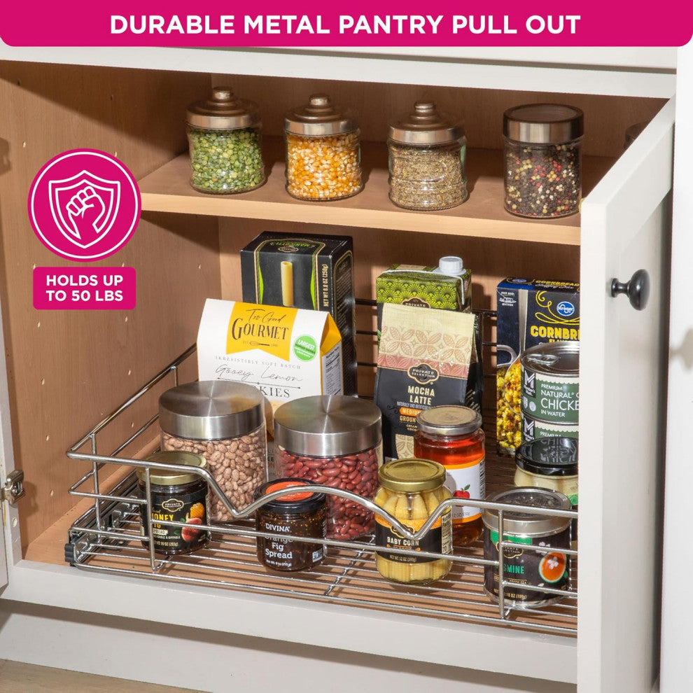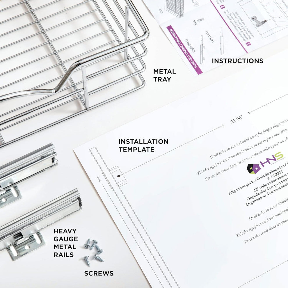 HEAVY-DUTY GAUGE WIRE: Made out of heavy-duty metal with an extra smooth sliding system to accommodate a large number of pots and pans.SMOOTH SLIDE-OUT DRAWER: This kitchen cabinet roll out shelf is manufactured with a system that slides out ultra-smooth. Other than other drawer organizers, our Pull Out Cabinet shelf slides out all the way, providing you with easy access.STURDY & RELIABLE STORAGE SOLUTION: Unlike other cabinet organizers and storage systems, which don''t provide, our Cabinet Pull Out Shelves feature elegant heavy wire construction which is durable enough to handle everything that you put in it and gives definitive style to your organized cabinets.EASY TO INSTALL & HARDWARE INCLUDED: Our pull out cabinet organizer dimensions measure 22"?W x 21"?D x 5"? and includes simple step-by-step instructions along with all of the hardware necessary for easy installation. Installs with just a few simple screws, and Fits cabinet openings 23-1/4"? and larger